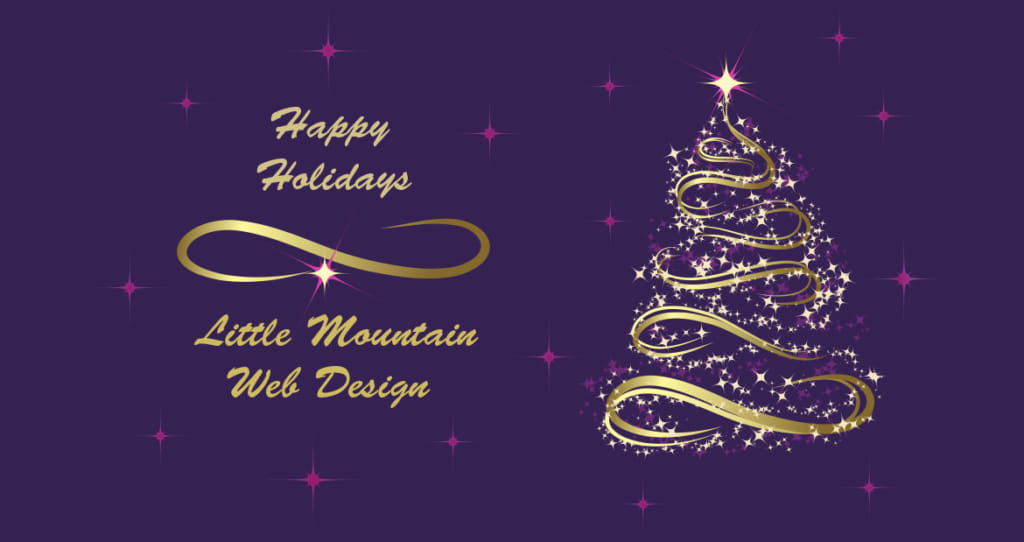 Purple background with stars and golden Christmas Tree and with text, “Happy Holidays from Little Mountain Web Design”