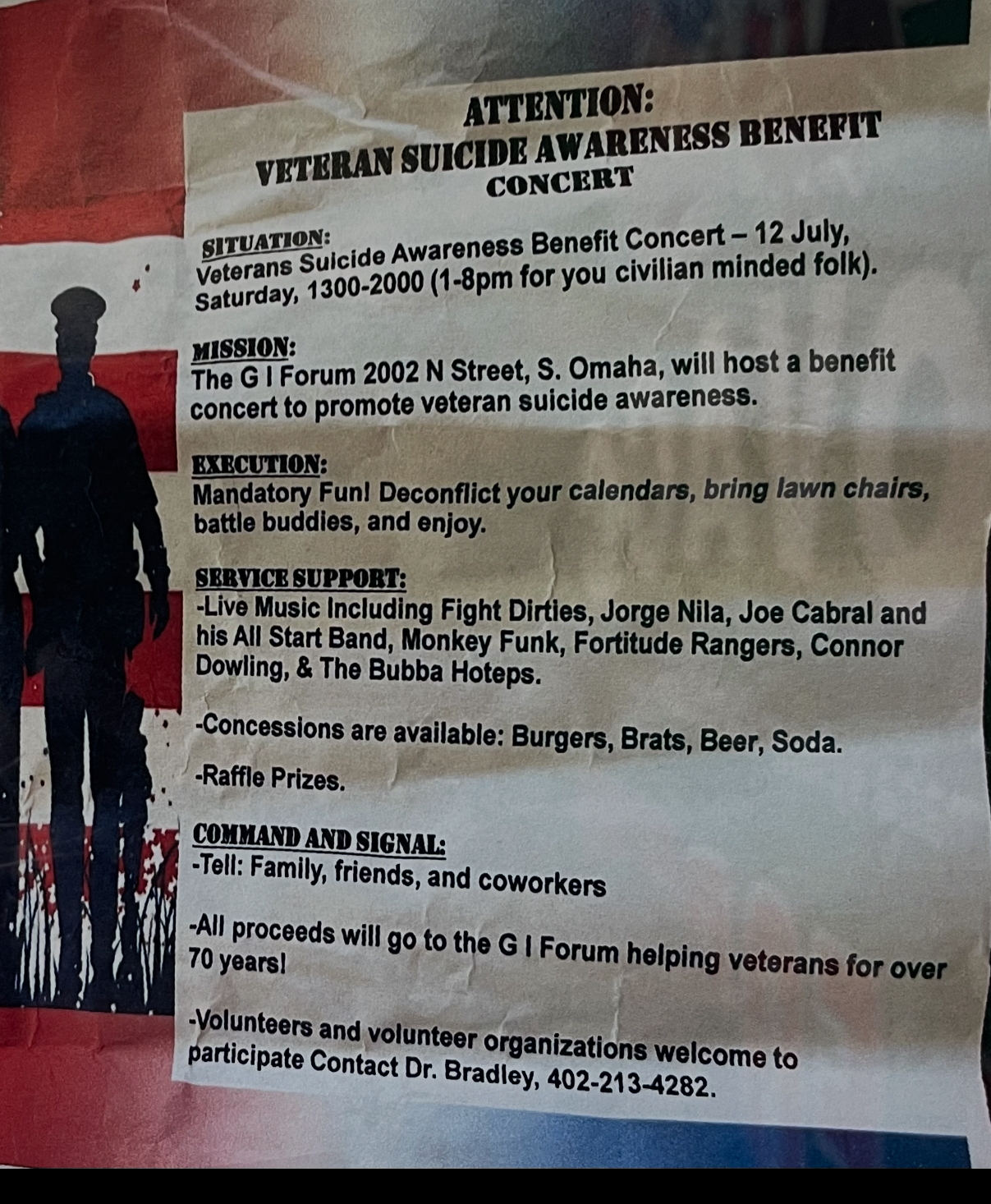 The South Omaha Veterans and Community Club is hosting the Veteran Suicide Awareness Benefit Concert on 12 July from 1-8 PM at the GI Fourm.