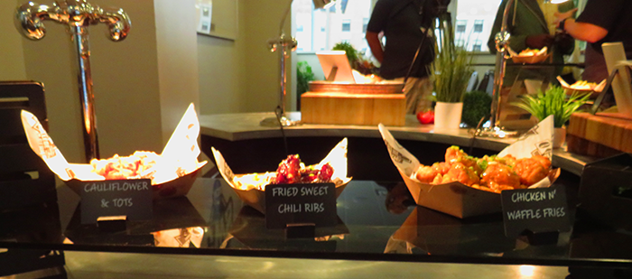 Previous ImageNext Image omahanebraskaDOTcomCWSFoodTasting2022CauliflowerTotsChiliRibsChickenwWaffleFries.700png Cauliflower with Tots, FriedSweet Chili Ribs and Chicken N Waffle Fries